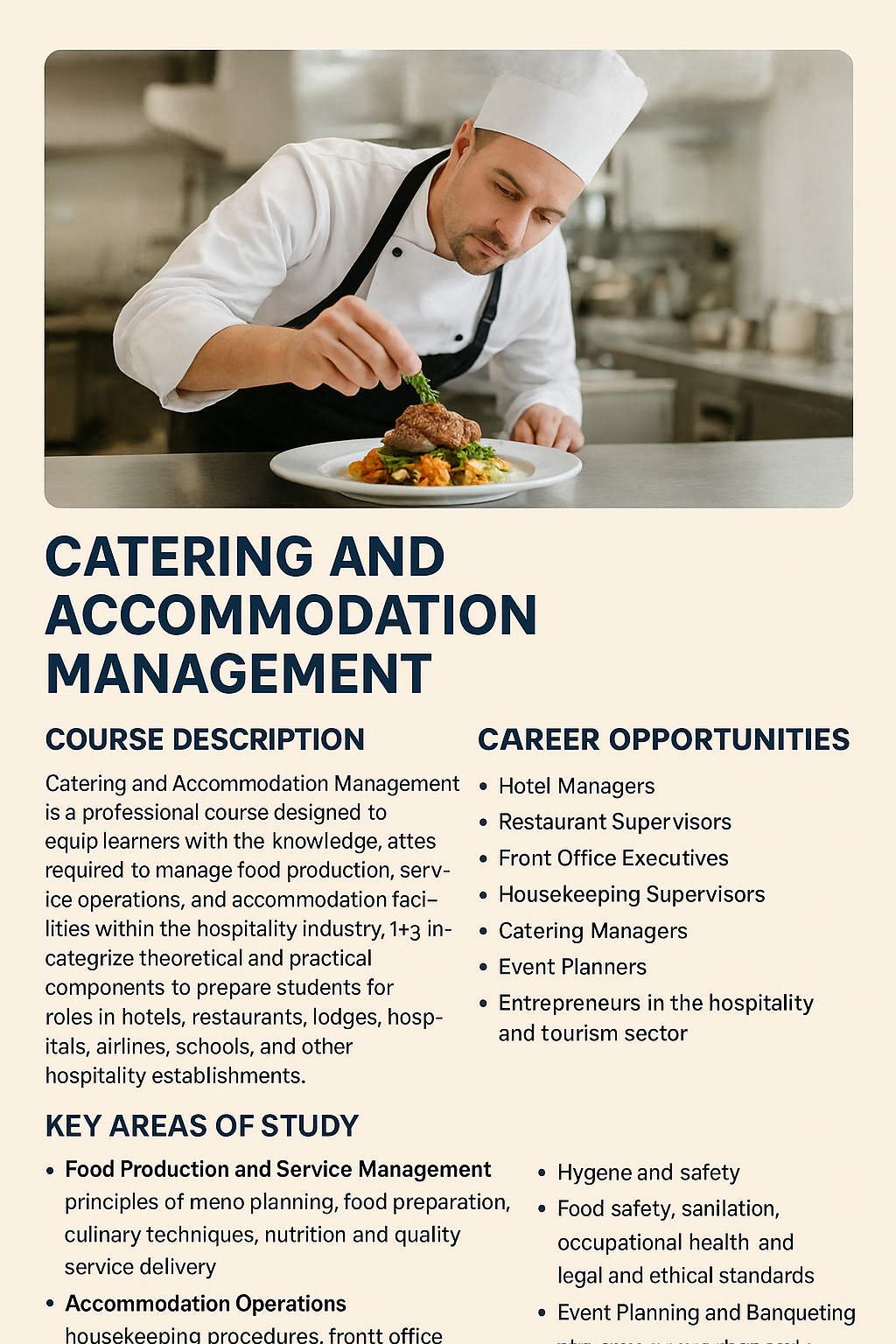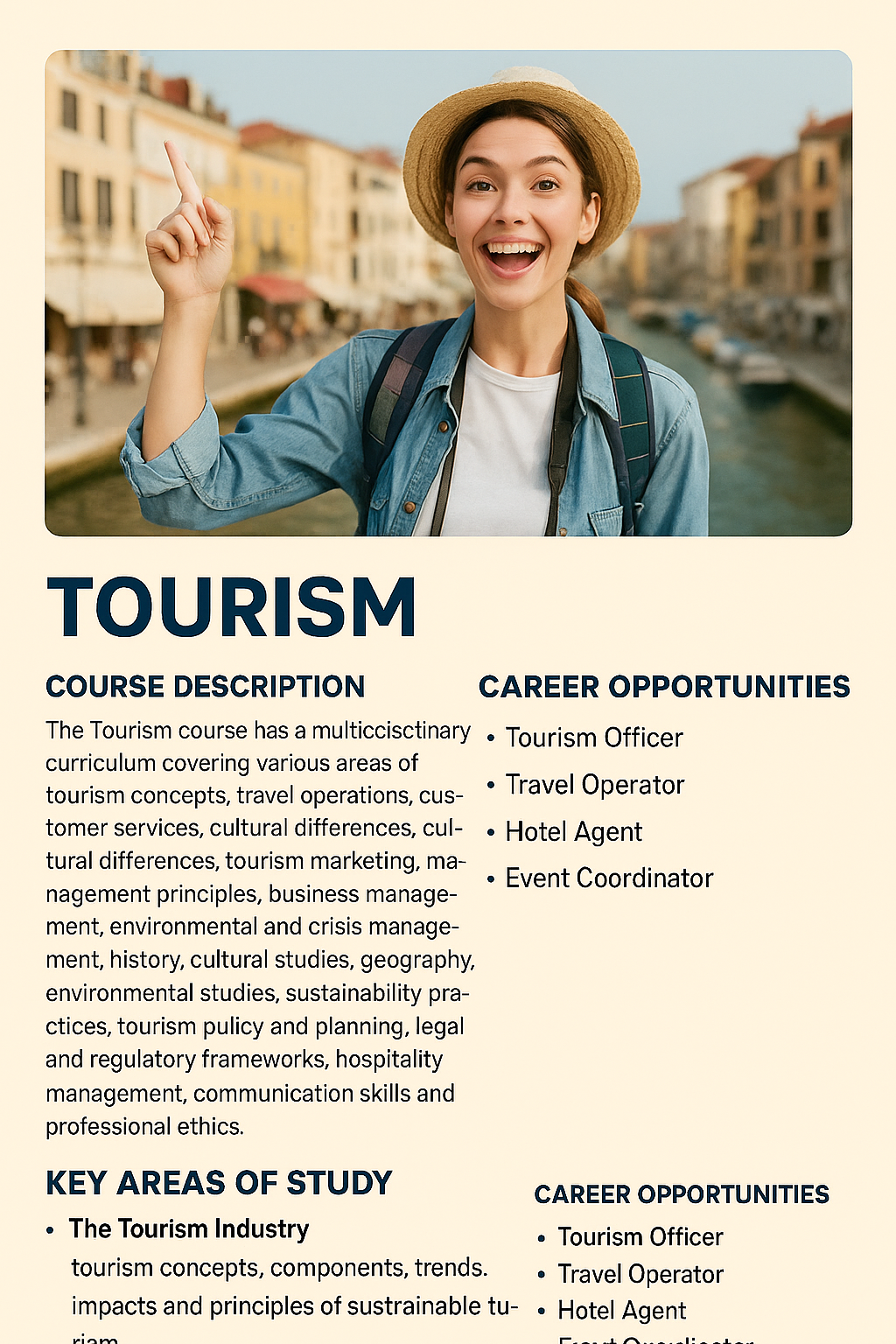Overview The Tourism course prepares learners to thrive in the dynamic travel and hospitality industry. It combines theoretical knowledge with practical training in tourism management, cultural heritage, customer service, and sustainable practices. Students gain the skills to design, manage, and promote tourism experiences that meet global standards while respecting local communities and environments.